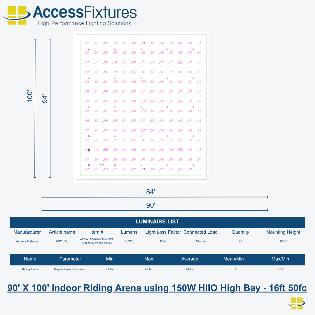 Indoor Riding Arena Lighting Package 90′ X 60′ 35fc, 2.02 Max/Min – 10 HIIO 150w – 16ft Mounting Height