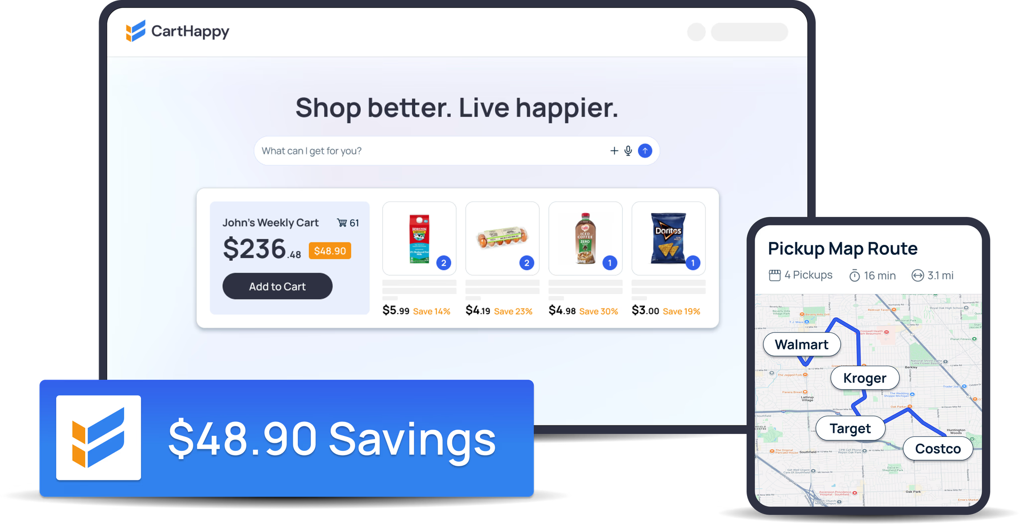 CartHappy connects with shoppers’ existing purchase history and combines it with real-time pricing data from local grocery stores. The platform helps shoppers build optimized carts showing where to get each item for the lowest price across their favorite stores, making it easy to capture real savings on their actual purchases.