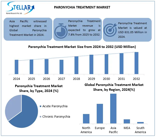 SACRAMENTO, CA, UNITED STATES, October 1, 2025 /EINPresswire.com/ — The Paronychia Treatment Market is valued at USD 631.05M in 2024 and projected to reach USD 1.15B by 2032, growing at a CAGR of 7.8%. Key trends, innovative therapies, and top players are transforming acute and chronic nail care solutions.